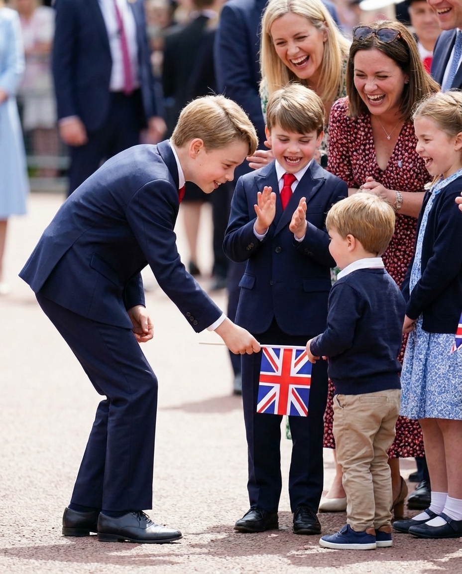 While George picked up the flag, his friend Louis stood beside him with enthusiastic applause, showing his support and excitement. His innocent remark, which made those around them laugh, added to the joy of the moment. This simple interaction encapsulated the spirit of community and the importance of caring for one another.
