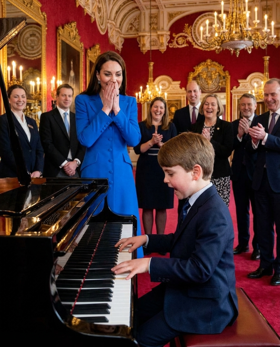 The surprise performance began as Prince Louis approached the grand piano, his tiny fingers resting on the keys. With boundless enthusiasm, he began playing a gentle melody that echoed throughout the room. Catherine, Duchess of Cambridge, watched with a mixture of surprise and pride, her smile illuminating the space. The joy of the moment was palpable, and soon those present began to applaud, praising the young prince's impromptu concert.